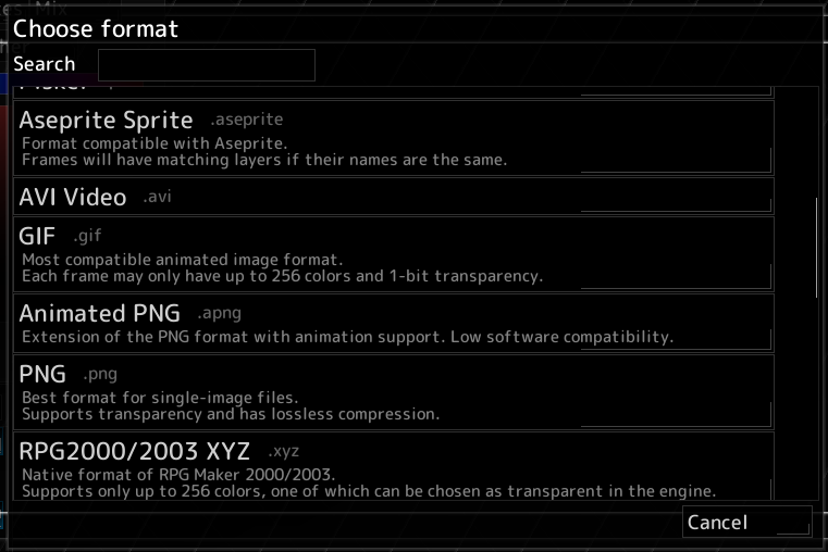 voidsprite has a lot of supported formats and letting the OS file picker manage them can get messy. This new format picker allows filtering and has descriptions for each format. In the future the most common formats will be sorted to the top of the list, and each format will have a list of supported features, like animation.